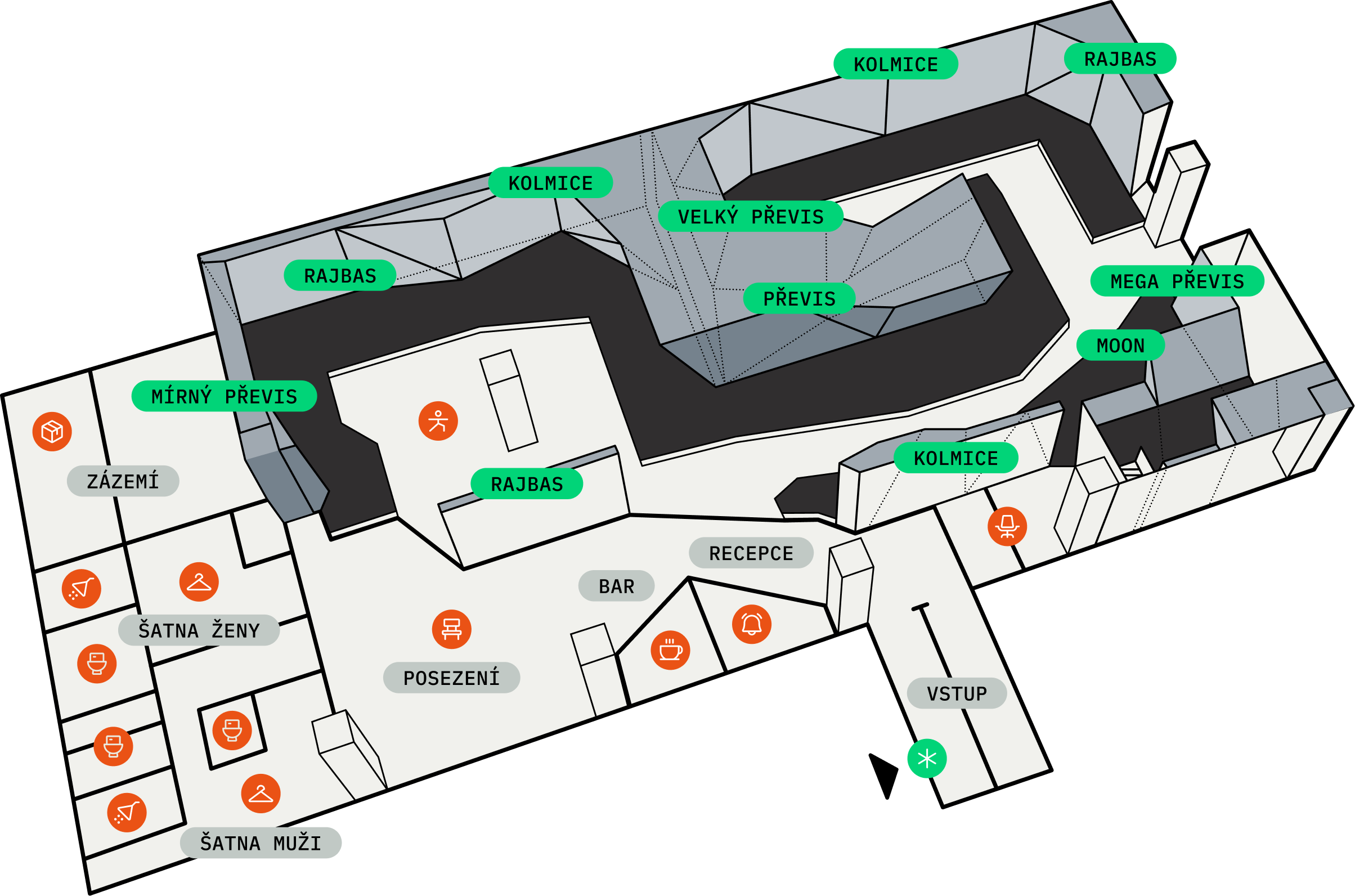 Posezení, malý obchod (v plánu) a samostatná tréninková zóna s spray-wallem